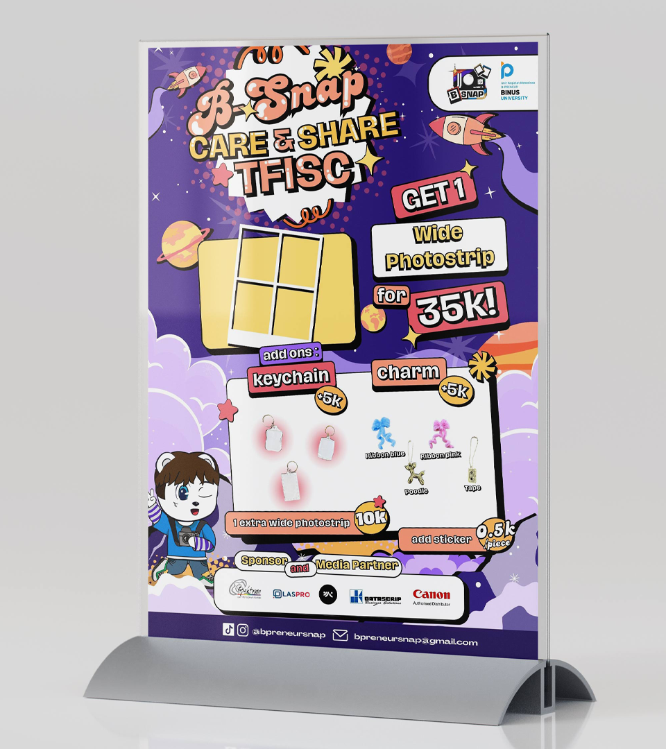 A Visual Communication Design student at BINUS University with a strong interest in graphic design and visual branding. Experienced in creating visuals for social media, campaigns, event publications, and branding. Skilled in crafting clear, impactful visual concepts.